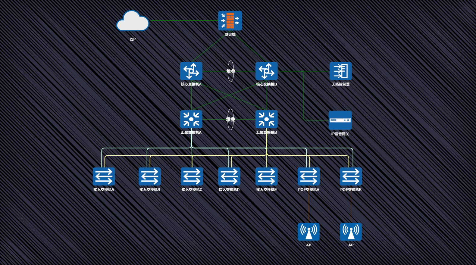 在负责的网络建设项目中,我成功主导并实施了以下核心工作:1) 采用双机堆叠技术部署了两台华为S5735-S24ST4XE-V2核心交换机,确保核心层高可用性;2) 同样以堆叠方式部署了两台华为S5735-L24ST4XE-A汇聚交换机,提升汇聚层可靠性;3) 通过配置链路聚合(LACP)实现了核心层与汇聚层之间的高速、冗余互联;4) 将核心交换机上行链路与深信服防火墙进行链路聚合对接,优化了出口带宽与可靠性;5) 在核心交换机旁挂部署了无线控制器;6) 汇聚交换机下行端口分别连接接入交换机及POE交换机,其中POE交换机为AP设备供电;7) 接入交换机负责连接各区域面板网口;8) 特别针对AP部署,采用了本地转发模式 减轻AC运行压力,并实现了AP的免认证自动上线,简化了运维管理,实现AP即插即用效果。